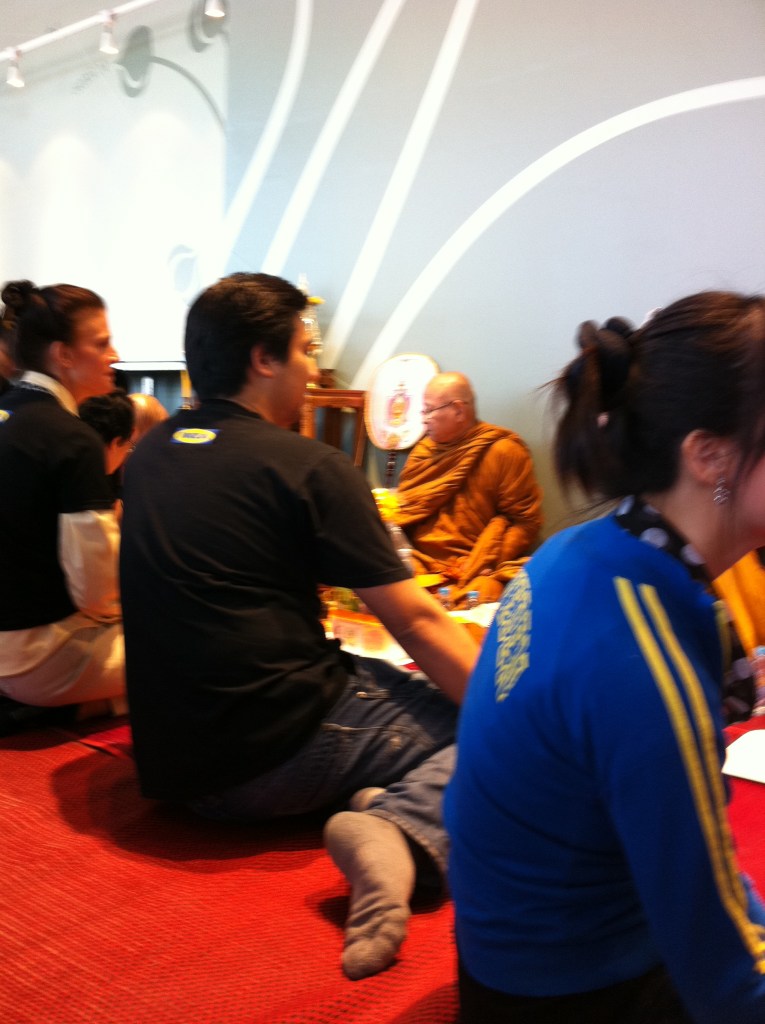 Before the all of monks gathered into the restaurant, one of them gently unrolled a large ball of wool and started to drape it around the perimeter of the room. Then as the other monks came in and sat in a line, crossed legged, the sole monk also included them in his wool wrapping. When he finished he blessed everyone with holy water before joining the line and sat on the end holding the wool.